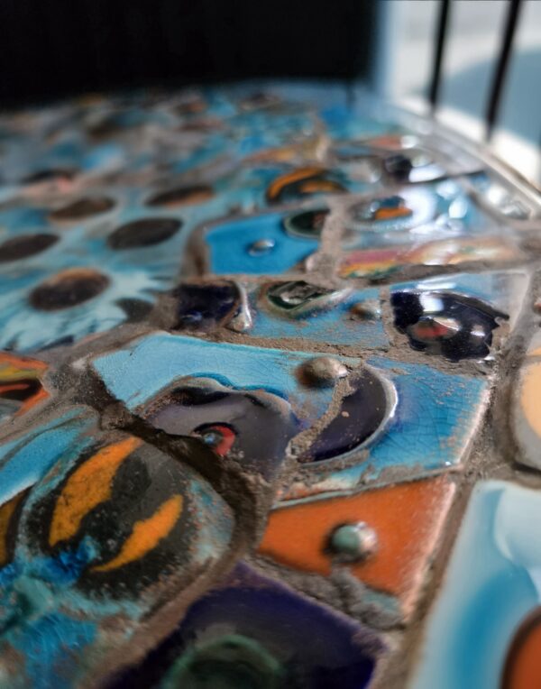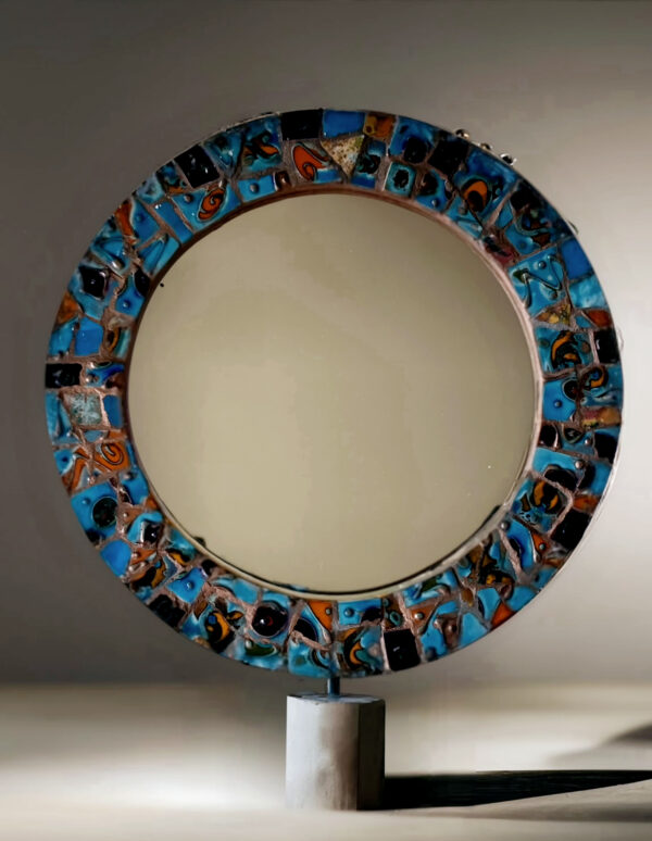 Ce miroir évoque la Méditerranée dans toute sa splendeur. les mosaïques de céramique aux dégradés de bleu allant du turquoise au marine profond ponctués de touches d’orange, évoquent les eaux cristallines et le coucher du soleil éclatant. Les motifs en relief rappellent les vagues créant une sensation de profondeur et d’infini.