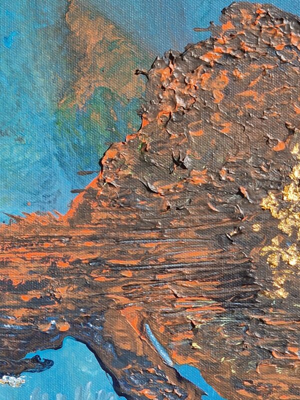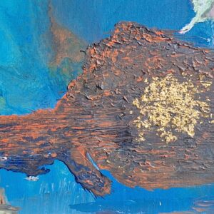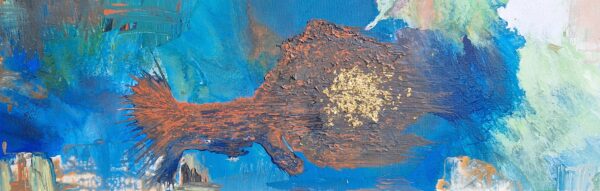 L’éclosion marine est une explosion de couleurs et d’énergie. La créature, dans sa course effrénée, semble vouloir briser les limites de la toile. Les tons orangés, chauds et vibrants, transmettent une sensation de vitalité et de joie. L’ensemble de l’œuvre est une célébration de la vie sous toutes ses formes.