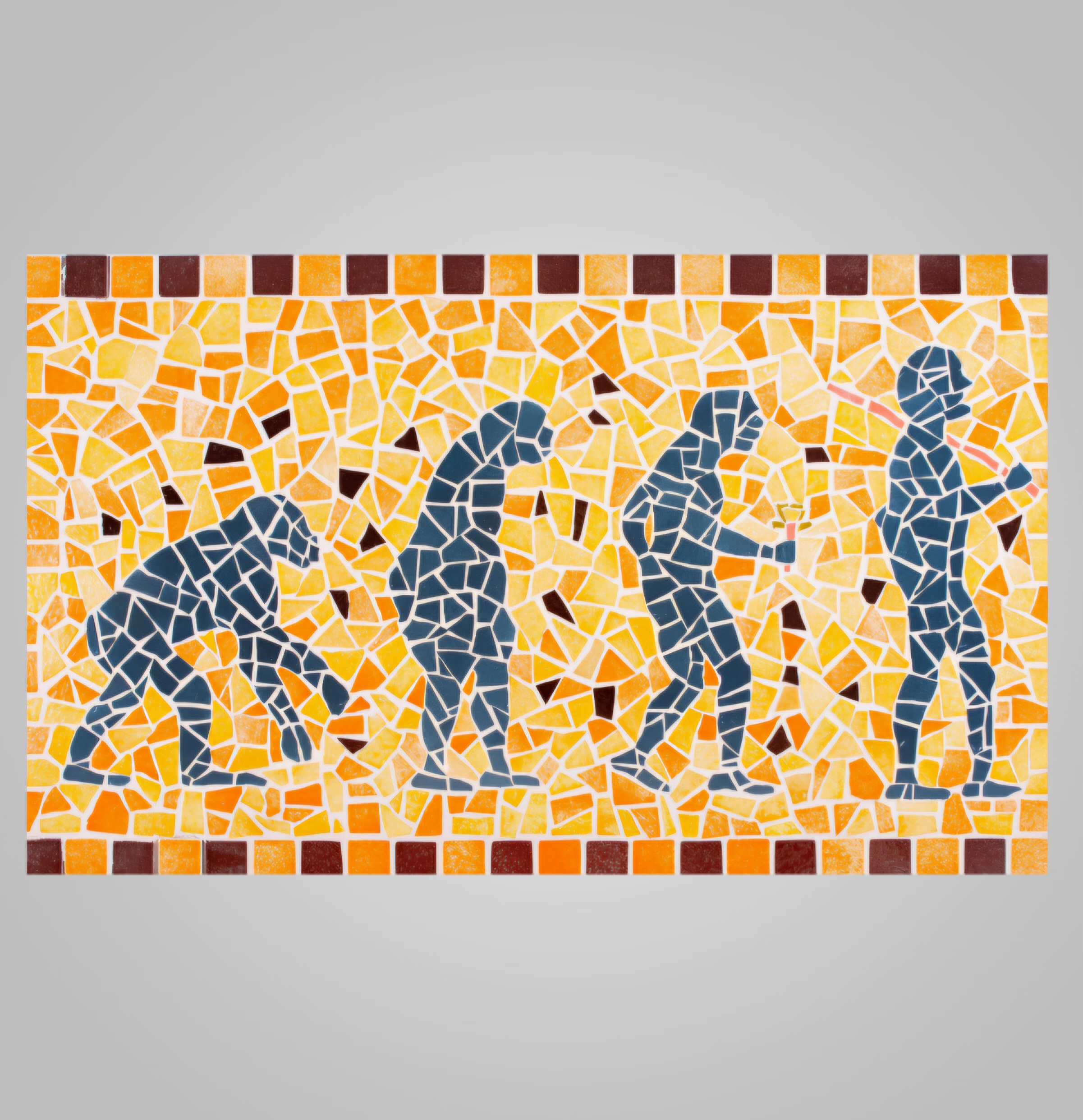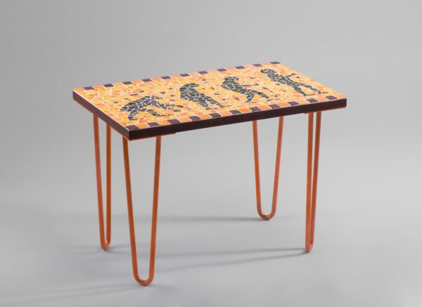 Les nuances de couleurs chaudes évoquent à la fois, la terre nourricière qui a vu naître l’humanité et le feu intérieur qui a alimenté son désir de comprendre et d’explorer le monde qui l’entoure. Cette palette de couleurs vivantes crée un contraste saisissant avec les motifs en ardoise.