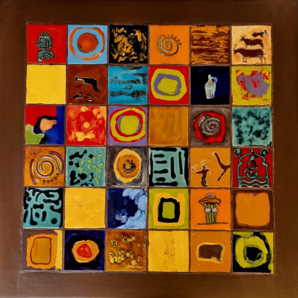 Des motifs géométriques et des représentations rupestres émergent en relief, ajoutant une dimension supplémentaire à l’œuvre.