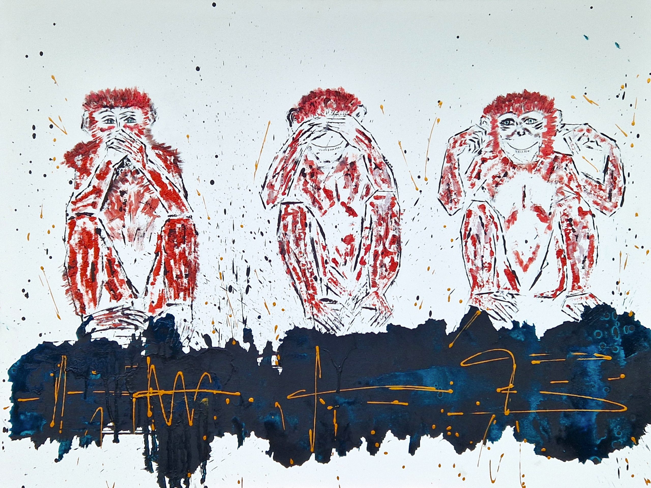 Sur cette toile, se dressent 3 singes sages, espiègles et malicieux incarnant la tranquillité et la connaissance. leur pelage brun en ciment. révèle chaque détail de leur noble présence.