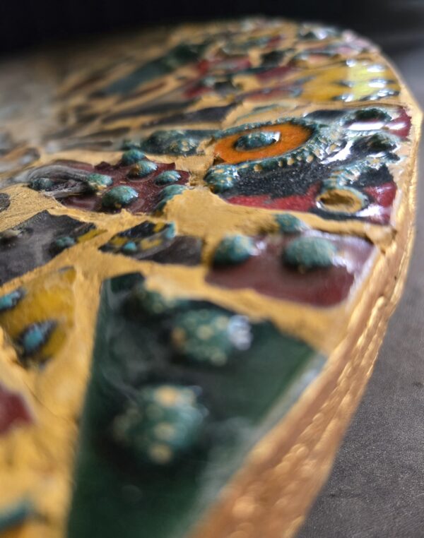 Les motifs en relief, évoquant les dunes et les roches érodées, invitent à caresser la surface et à explorer chaque recoin de cette œuvre.