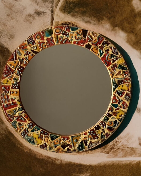 Ce miroir rond est une ode au désert. les nuances chaudes qui rappellent le sable, le soleil et les pierres brûlantes forment un paysage envoûtant.