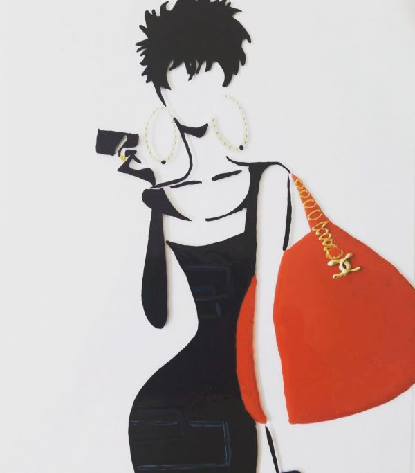 Tel un spectre lumineux, l’It-girl se dessine sur le verre. Sa silhouette, à la fois fragile et puissante, évoque la femme moderne, libre et indépendante. La robe noire, moulante et élégante, contraste avec la vivacité du sac à main rouge, symbole d’une énergie débordante.