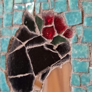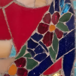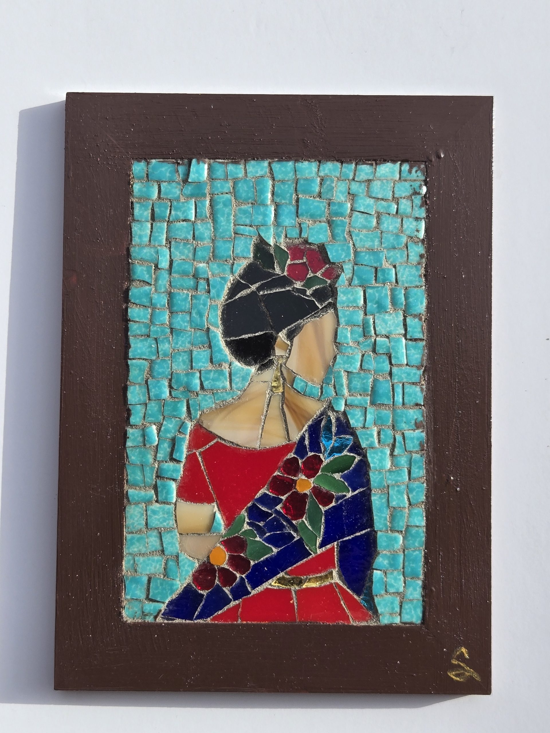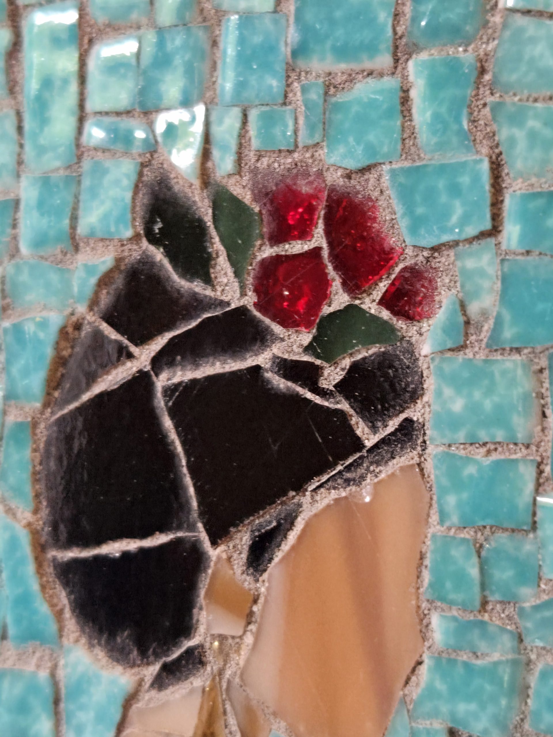 Mosaïque de verre figurative, composée de verre américain et d’émaux de Briare, encadrée de bois. Pièce unique,18×13 cm
