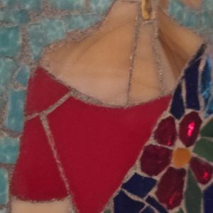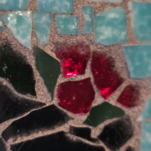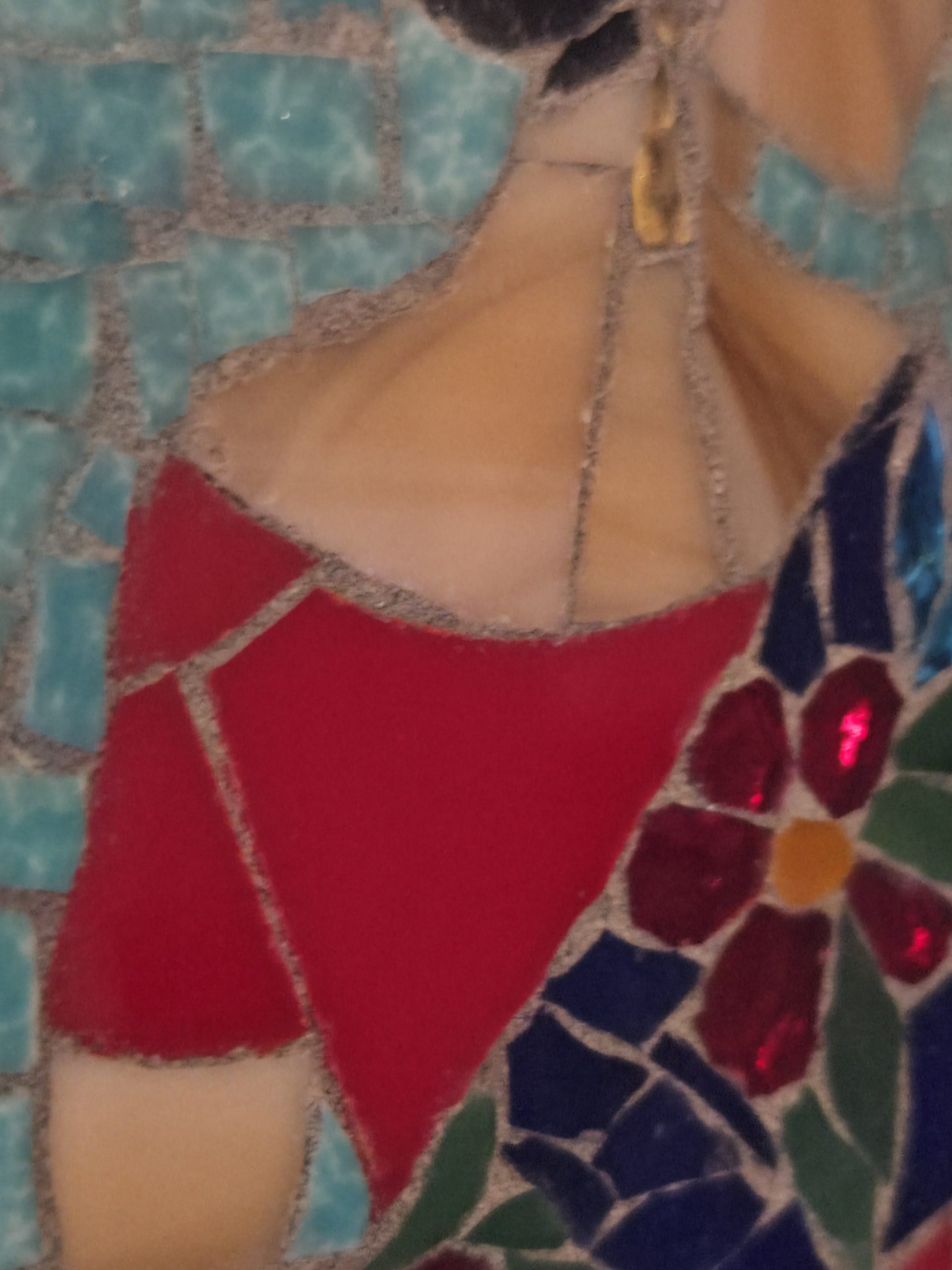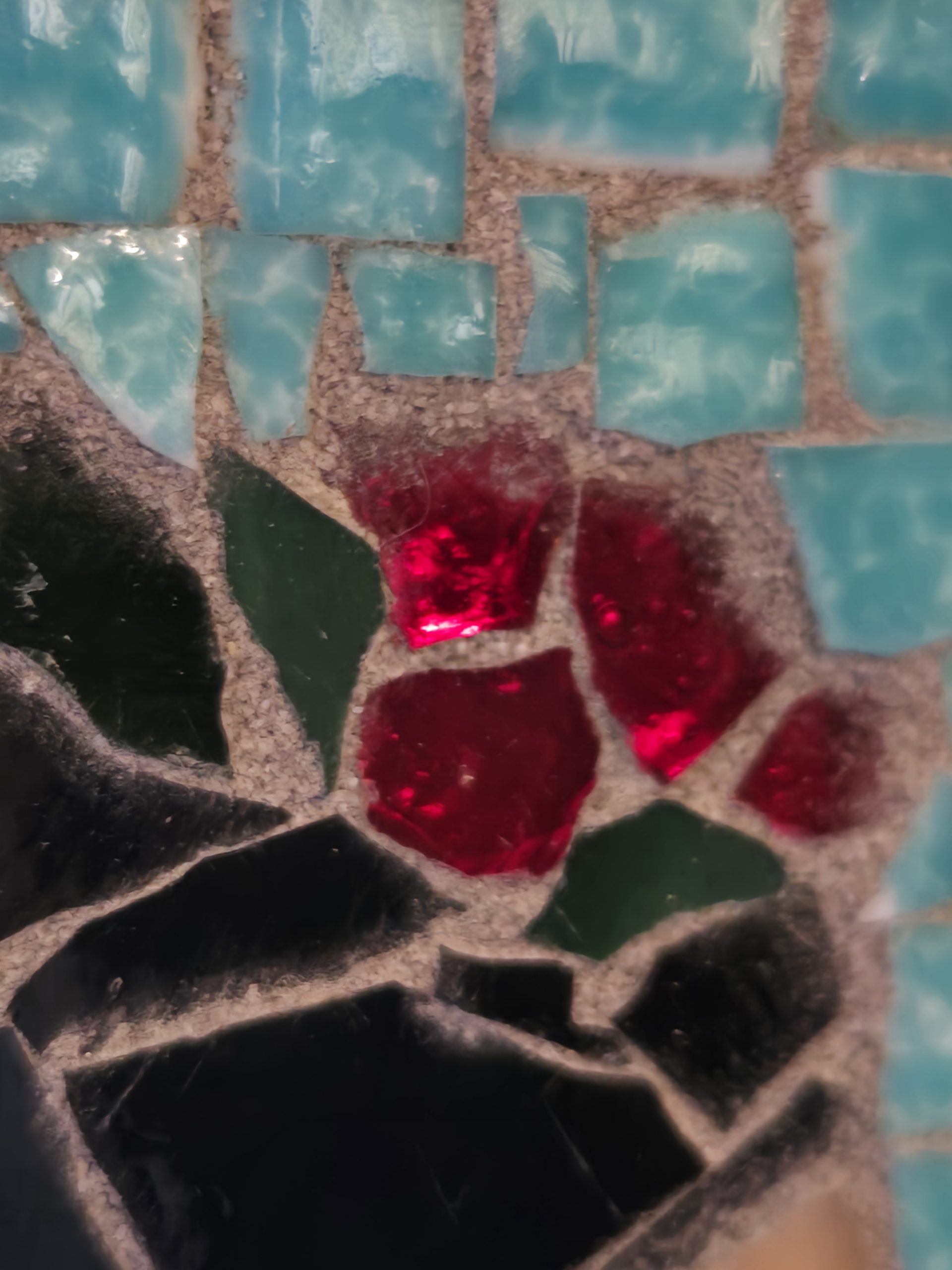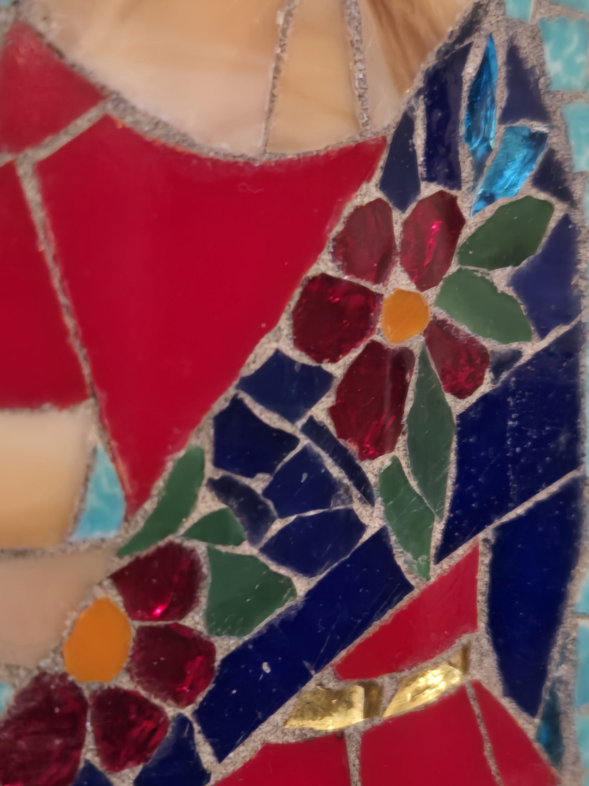 Mosaïque de verre figurative, composée de verre américain et d’émaux de Briare, encadrée de bois. Pièce unique,18×13 cm