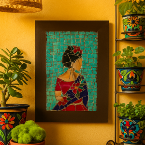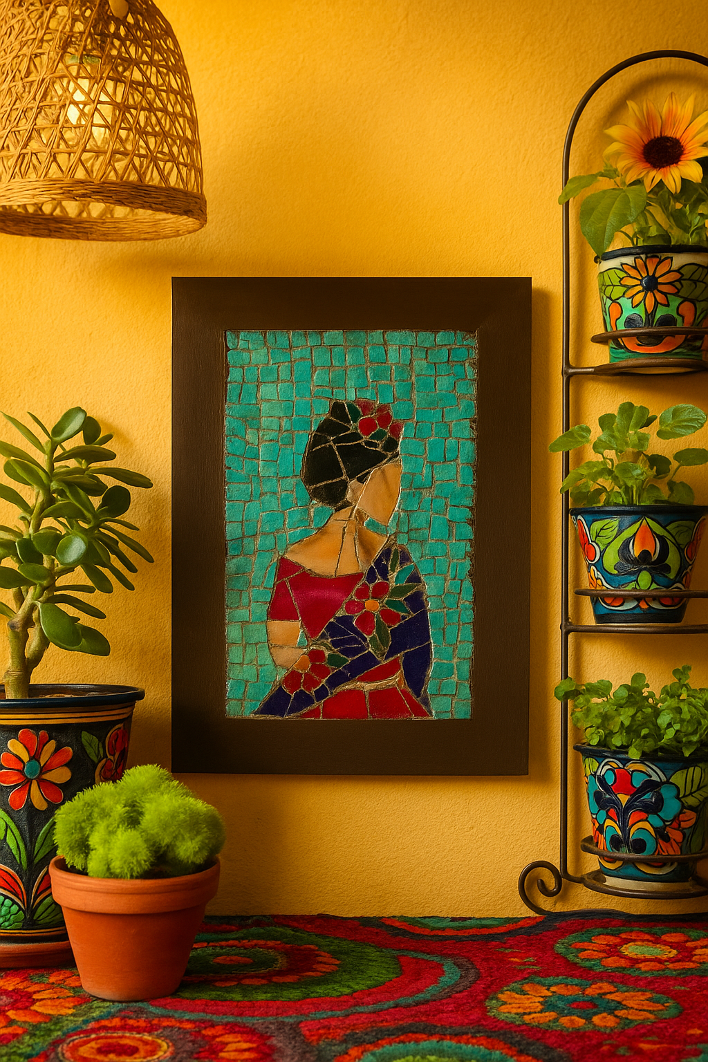 Rubéa évoque une féminité fière et vibrante, inspirée par les formes traditionnelles et florales. La posture suggère une retenue élégante, tandis que la richesse de la palette capte immédiatement le regard. L’oeuvre incarne la joie, la force et la délicatesse. Le rouge intense symbolise l’énergie et la passion, tandis que le fond turquoise apporte fraîcheur, lumière et contraste. Le châle fleuri établit un lien subtil entre tradition et modernité. Le dos tourné laisse place à l’imagination: il invite le regard à suivre une histoire plutôt qu’à la deviner.